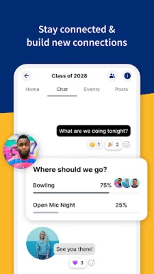Explore and Discover: Find new communities and connect with fellow students through messaging, polls, and campus-wide events.